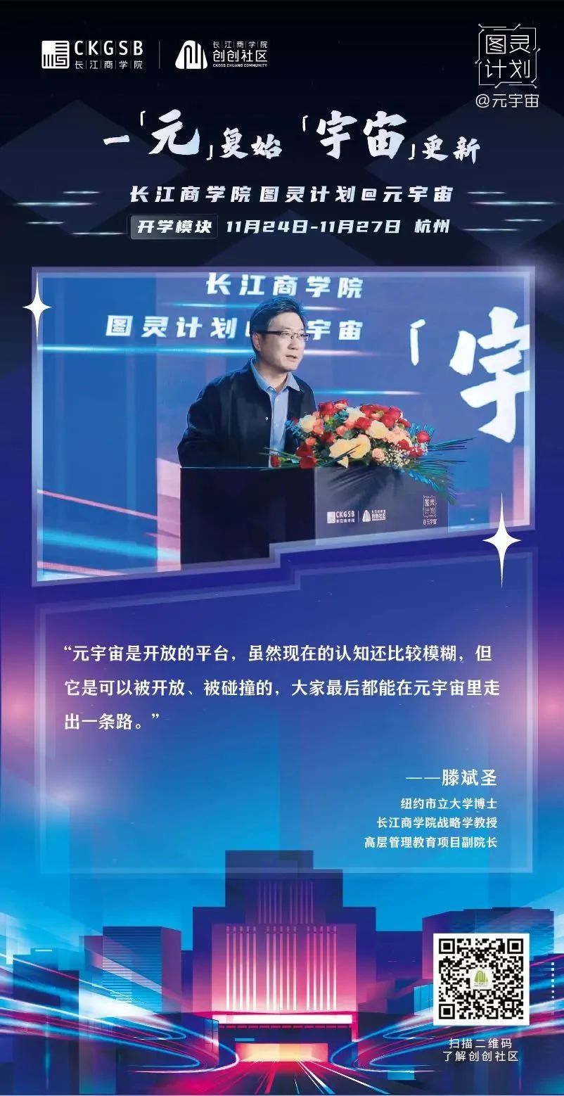 2022年11月24日,长江商学院「图灵计划@元宇宙」项目正式开学!三十余位元宇宙相关行业创业者以线上线下相结合的方式齐聚杭州,共议元宇宙发展趋势、共谋元宇宙全新商机、共划虚拟世界的商业未来。(长江商学院「图灵计划@元宇宙」同学全名录) 长江商学院长江商学院战略学教授、高层管理教育项目副院长滕斌圣、长江商学院金融学教授、长江商学院教育发展基金会理事长周春生、杭州市经济和信息化局技术创新处处长、复星集团联合联合创始人梁信军、中国电子信息产业发展研究院电子信息研究所所长温晓君等六位专家学者、业界精英与同学们畅谈元宇宙,从学界、商界、技术层面等各自的专业领域出发,分享自身多年的行业洞察,为同学们带来精彩纷呈的讲学,共同探索元宇宙的奥秘。新生代表、修远资本联合创始人赵英明在开学仪式上也分享了在元宇宙商业落地中实践中的期待。