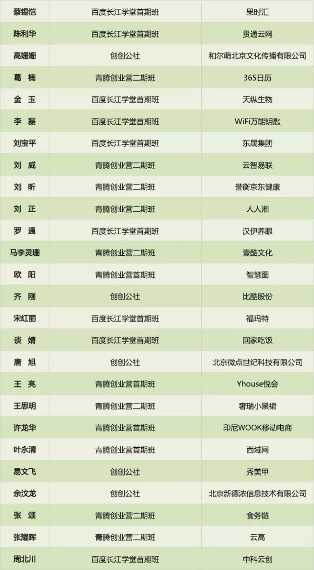 本次春茗会也得到了创创学员们的大力支持。感谢青腾创业营、百度长江学堂、创创公社的同学们为此次活动提供的赞助支持:
