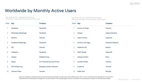 App Annie是权威的全球App市场数据、前沿业界观察和一站式平台,移动应用与数字内容时代数据分析的行业领导者,追踪了超过600亿的下载量和170亿美元的应用商店收入。榜单显示,2017年,全球范围内月活跃用户数最多的产品分别为:Facebook、Whatsapp Messenger、Wechat(微信)、Facebook Messenger、QQ、Instagram、Taobao(淘宝)、Aliplay(支付宝)、WiFi Master Key(WiFi万能钥匙)、Tencent Video(腾讯视频)。