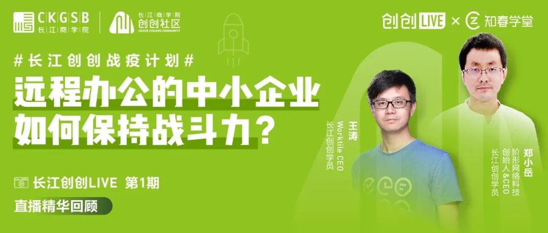 今天为大家呈现的,是「创创LIVE」的第1期精华内容。2月20日,我们邀请了Worktile 创始人、CEO王涛以及阶形网络科技创始人、CEO 郑小岳,与知春学堂智创首期班的同学们分享“远程办公的中小企业如何保持战斗力”。