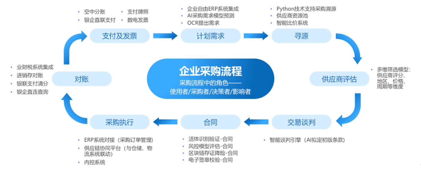 以企业用户采购流程举例:从提出需求、寻源、供应商评估、谈判签约、采购执行到对账、支付和索取发票,每一个环节都可以被重构和数字化(参见图1)。