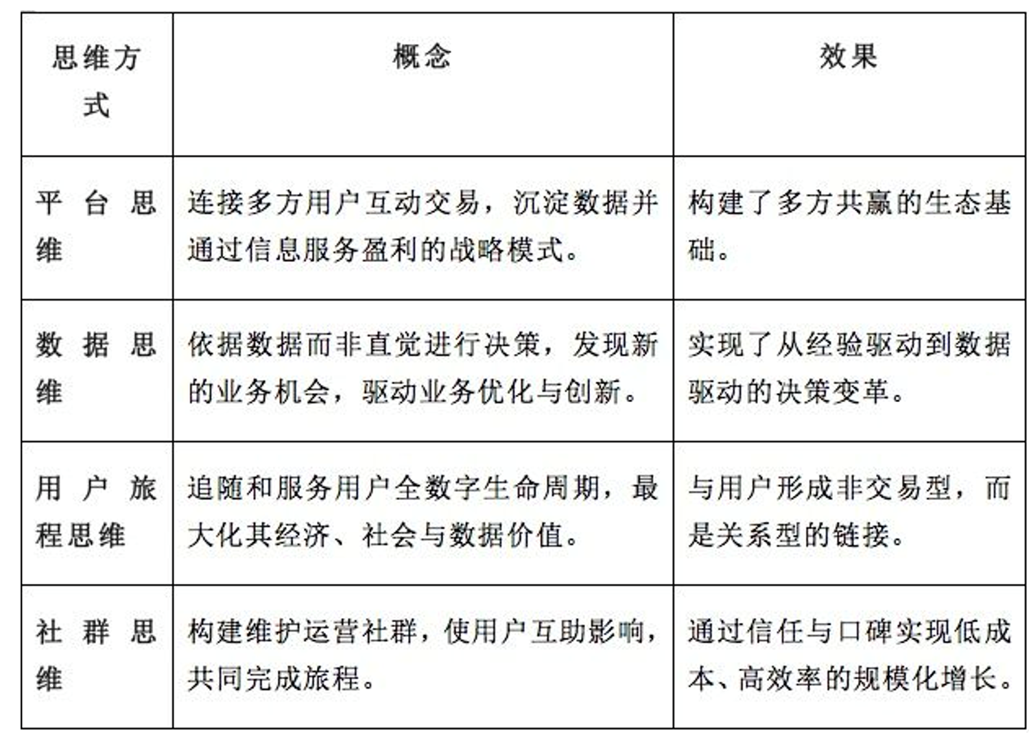 这家传统建筑企业的数字化跃迁之路,深刻诠释了平台思维、数据思维、用户旅程思维与社群思维这四大数字化核心思维的价值(见表1)。